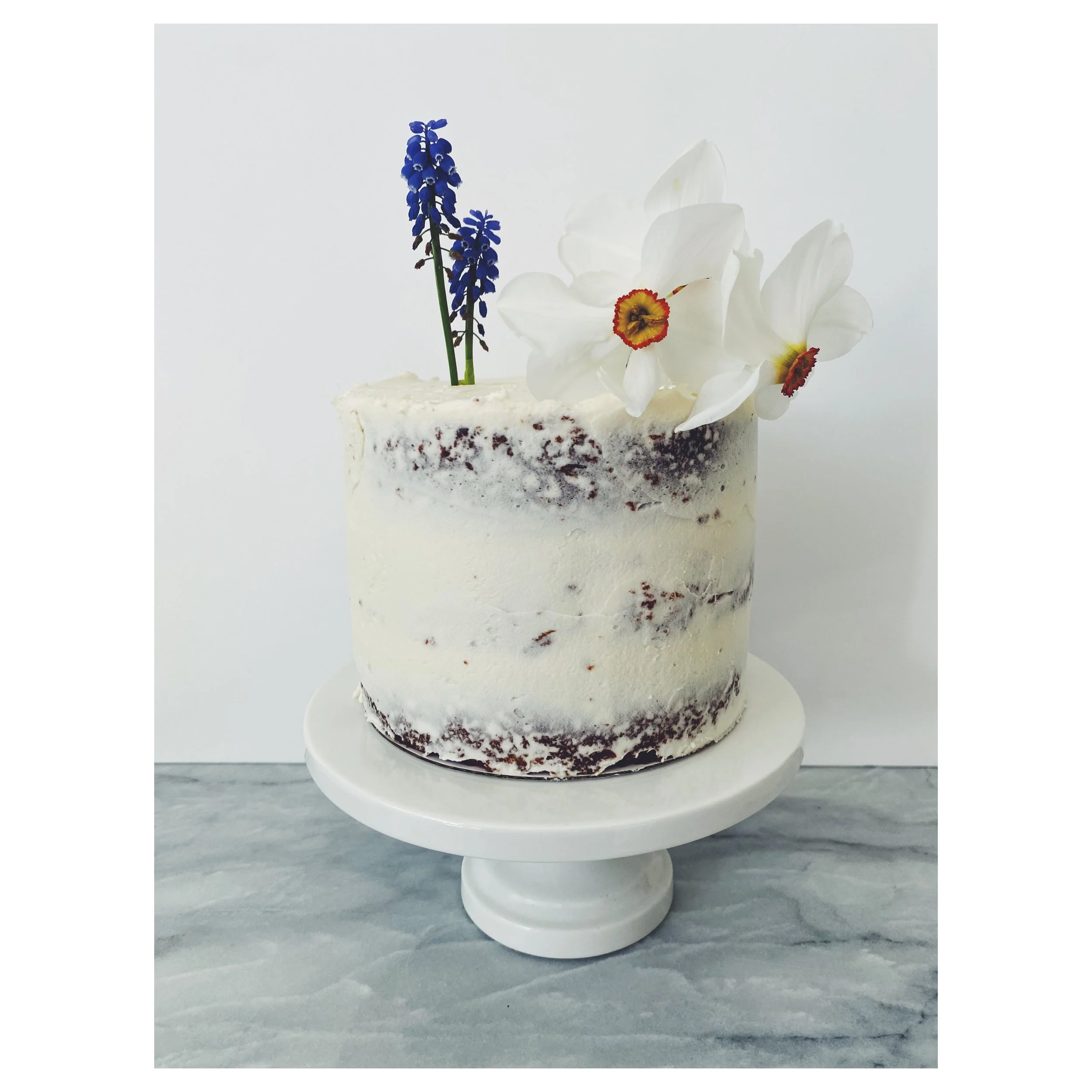 Goth-dark chocolate cake flavored with too much coffee (you know better) and frosted in Bavarian Cream, the filling of choice for every birthday party cake of my childhood. On top is an opinionated, bittersweet ganache hastily applied without forethought, a partially-dried red rose for complicated love, and some dried calendula flowers for bright and optimistic thoughts. Yet the end result is incomplete due to the missing half-slice.